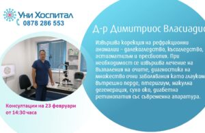 Д-р Димитриос Власиадис, специалист по очни болести, ще преглежда в МЦ-Панагюрище, който е част от МБАЛ „Уни Хоспитал“. Прегледите ще се състоят на 23...