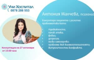 Антония Малчева, психолог и психотерапевт, ще консултира пациенти в МЦ „Панагюрище“ на 27 октомври (четвъртък) от 15:00 до 18:00 часа.Консултациите включват различна проблематика като: