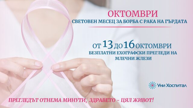 От „Уни Хоспитал“ съобщават, че през октомври специалистите от Отделението по гръдна хирургия и Отделението по образна диагностика посвещават дни на профилактиката. Жените ще могат да се възползват от безплатни прегледи и ехография на млечни жлези.