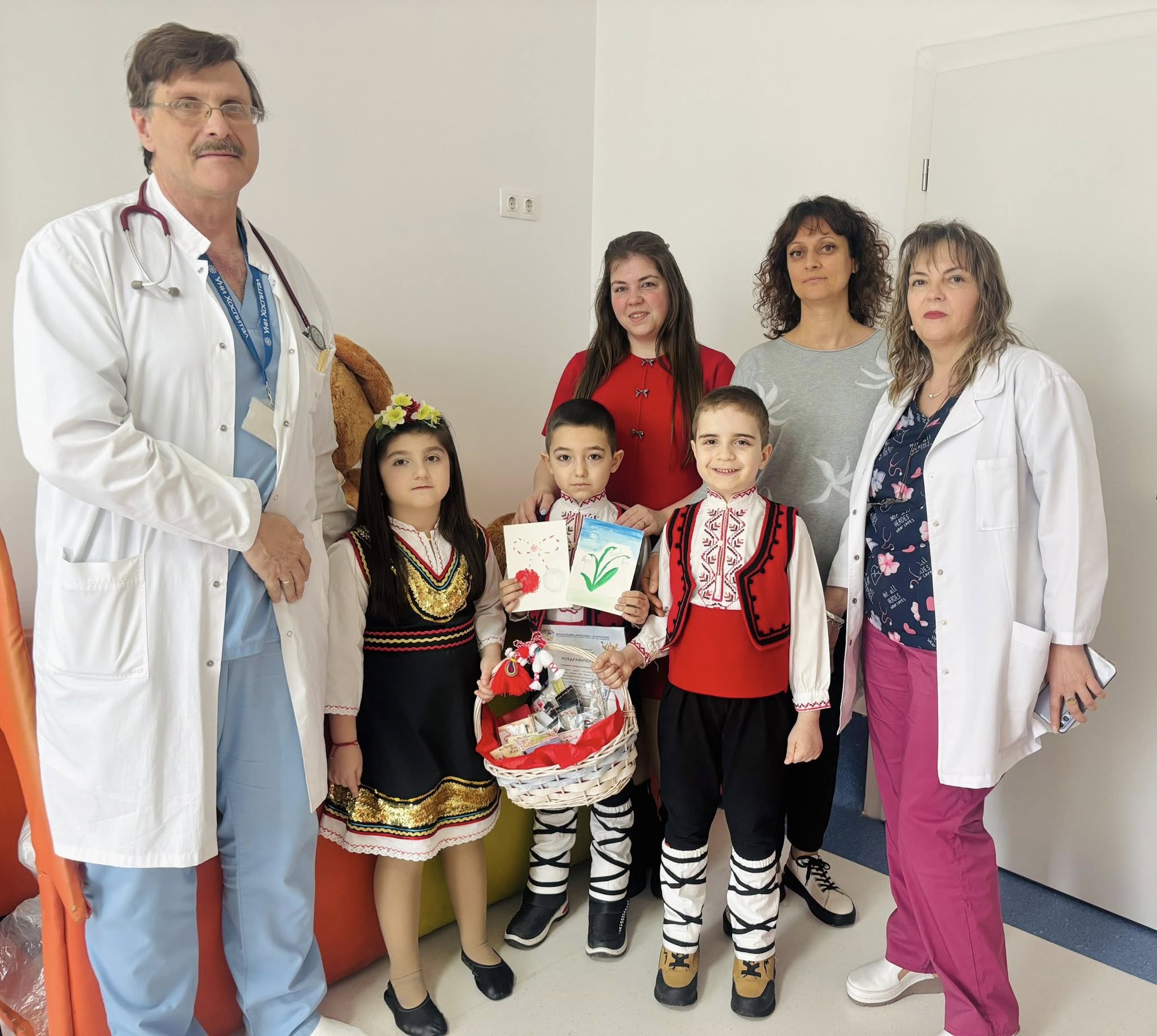 Вчера в отделението по педиатрия на МБАЛ „Уни Хоспитал“ пристигнаха малки гости с големи сърца – три прекрасни деца от ДГ „Първи юни“ – гр. Панагюрище, облечени в традиционни български носии и носещи в ръцете си един от символите на пролетта.