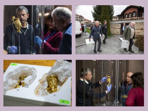 Оригиналът на Панагюрското златно съкровище се завърна днес в залата трезор на Историческия музей. Над един час музейни специалисти от София и Панагюрище работиха по експонирането на безценните антики. И тази година всички разходи по транспортирането, охраната и застраховката на уникалните артефакти се поемат от „Асарел-Медет“АД. Съкровището ще остане в Панагюрище до 18 май.